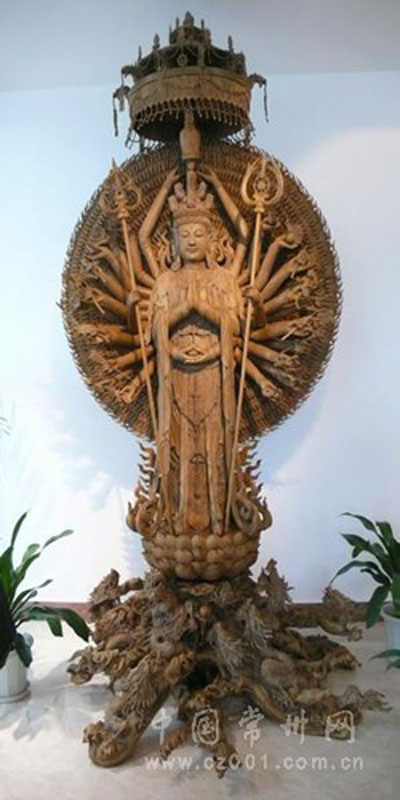 在佛學里,千手千眼觀音是觀音菩薩的變化身。一根長306厘米、最大直徑36厘米的沉香木,據悉目前市場評估價每公斤達8.4萬元,福建莆田市美誠達雕塑研究所所長、號稱“天下第一刀”的國家一級工藝美術大師李鳳強,正是用這塊價值連城、重近800公斤的“沉香王”雕刻成了“沉香千手千眼觀音”。整塊木料完整堅實,伴有清香。他運用浮雕、透雕、立體鏤空雕等多種手法,分成十幾個層次,將千手千眼觀音的形象刻畫得栩栩如生,慈悲卻又莊重平穩。