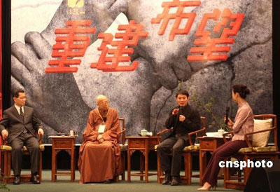 二OO八年六月一日下午,法鼓山文教基金會在臺北市舉辦“重建希望——從四川震災談起座談會”。法鼓山創辦人圣嚴法師(左二)在座談會上宣布,法鼓山要為四川災區重建做六件實事:為綿陽市安縣秀水鎮重建二所小學;為秀水鎮建一所中學;在秀水鎮建一所醫院;為秀水鎮重建自來水廠;重建新村,為村民蓋房子;設立獎學金幫助受災青少年完成從小學到中學的學業。曾主持臺灣“九二一”地震重建的蕭萬長(左一)及著名影星李連杰(右二)也出席座談會。