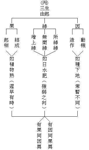 體相用里面,特別從相上下手,研究差別的現象怎么來的?‘生起三由’:現象的發生有三個條件,這三個條件就是‘因、緣、果’。這一段就是體相用三分里面‘相’的注解,就是對于相的深入觀察;它有因、有緣、有結果,結果就是這個相(幻相)形成。