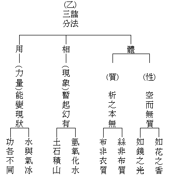 這一段提示我們研究的方法。‘諸法三分’:諸法是指宇宙人生一切法(世出世間一切法)。這是教我們在一切法里面觀察,要面面俱到,不能只看一面,看一面就會發生誤會,如果面面都看到就圓融。‘三分’:大到整個宇宙,小至一微塵,都有這三個部分,那就是體、相、用。它的本體、它的相狀,以及它的作用,這三樁事情是一而三,三而一;三方面都能正確的理解,才將這個法看透,得到它的真相。